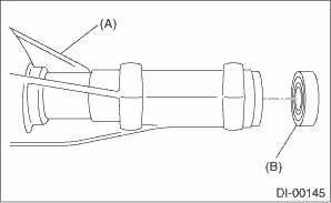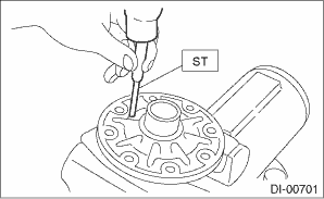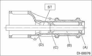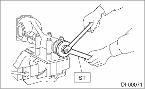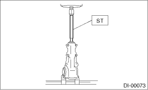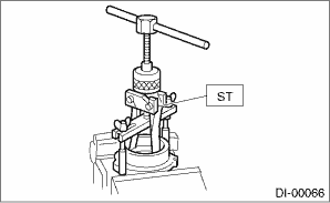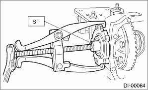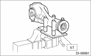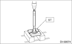 16. Press the end of drive pinion shaft using ST and remove the rear bearing cone, pinion height adjusting washer, preload adjusting spacer and washer.