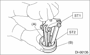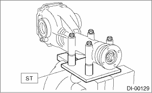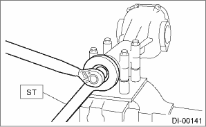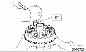 18. Press the end of drive pinion shaft using ST and remove the rear bearing cone, pinion height adjusting washer, preload adjusting spacer and washer.