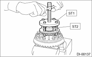 9. Remove the bearing race from side retainer RH and LH with ST1 and ST2.