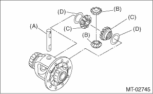 3. Pull out the pinion shaft, and remove the differential bevel pinion, differential bevel gear and adjusting washer.