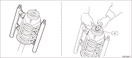 When installing the coil spring compressor to the coil spring, follow the operation manual accompanied with the coil spring compressor during operation.