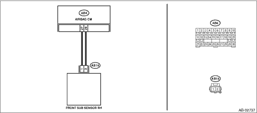 Check for poor contact of the connectors (AB6, AB16) between the airbag control module and the front sub sensor (RH).