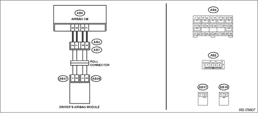 4) Disconnect the connectors (AB6, AB17, AB18) from the airbag control module, and connect the connector (1AG) in the test harness AG.