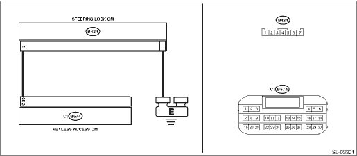 Using a tester, measure the resistance between steering lock CM connector and chassis ground, and between keyless access CM connector and chassis ground.