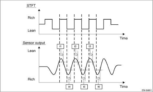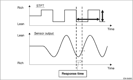 Change STFT (A/F compensation value) by interruption, and measure the reaction time of λ value. When A/F sensor malfunctions, the reaction time takes longer than at normal condition. In this case, judge as abnormal.