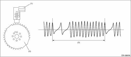 (1) | Crankshaft position sensor | (2) | Crankshaft position sensor plate | (3) | Crankshaft half-turn |