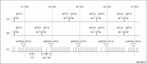 (A) | Camshaft signal (RH) | (B) | Camshaft signal (LH) | (C) | Crankshaft signal |