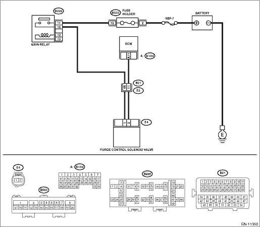 • Open circuit in harness between ECM connector and purge control solenoid valve connector