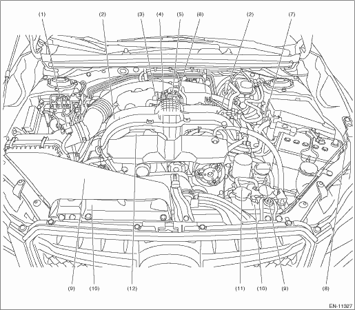 (1) | Mass air flow and intake air temperature sensor | (5) | Crankshaft position sensor | (9) | Intake camshaft position sensor |