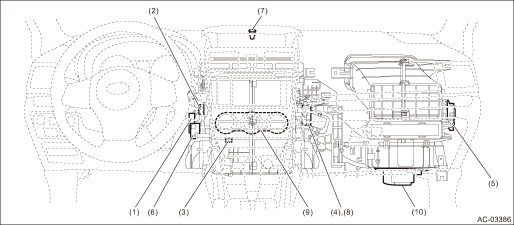 (1) | Air mix door actuator LH*2 | (5) | Intake door actuator | (9) | A/C control panel |