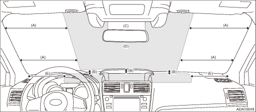 – Damage in the prohibited area can affect the recognition of the stereo camera even if it is repaired, and thereby EyeSight function may not operate properly.