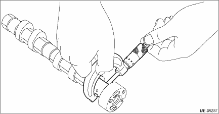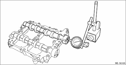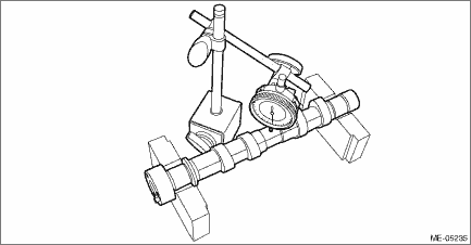 4. Using a dial gauge, check the camshaft bend. If it exceeds the limit, replace the camshaft.