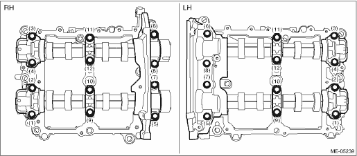 (6) Loosen the bolts (front camshaft cap, intake center camshaft cap, intake rear camshaft cap, exhaust center camshaft cap and exhaust rear camshaft cap) equally, a little at a time in numerical sequence as shown in the figure, and remove each camshaft cap.