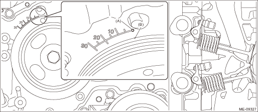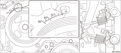 When the timing mark (B) on crank pulley is aligned to the 0° in timing gauge (A) on chain cover as shown in the figure, the #1 cylinder piston is located at TDC of compression stroke if the intake camshaft and exhaust camshaft does not depress the #1 cylinder intake side roller rocker arm (intake valve) and exhaust side roller rocker arm (exhaust valve). If roller rocker arm (valve) is depressed, turn the crank pulley by 360° in order to make #1 cylinder piston at TDC of compression stroke.