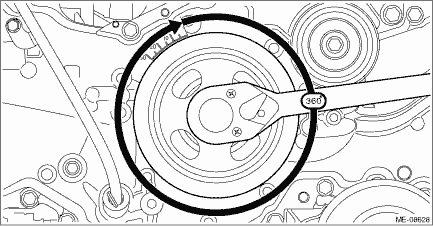 (2) Set #2 cylinder piston to top dead center of compression stroke by rotating the crank pulley clockwise using the socket wrench.
