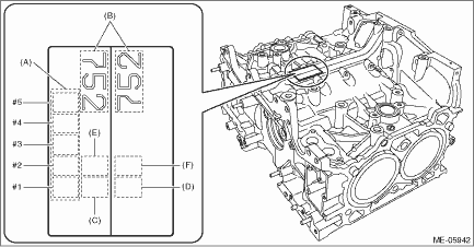 (A) | Main journal size mark | (C) | #1 cylinder bore size mark | (E) | #3 cylinder bore size mark |