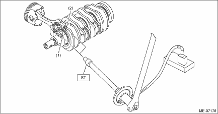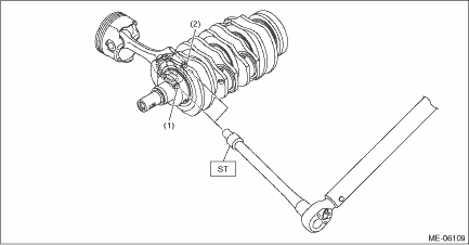 (4) Using ST, tighten the #1 connecting rod cap bolts to 10 N·m (1.0 kgf-m, 7.4 ft-lb) in numerical order as shown in the figure, then retighten the bolts to 22 N·m (2.2 kgf-m, 16.2 ft-lb) in numerical order as shown in the figure.