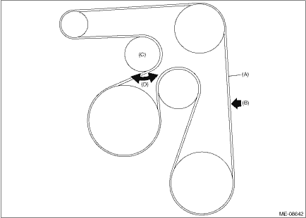 4. Check that the V-belt tensioner assembly (C) moves in the direction of arrow (D), when the V-belt (A) is pushed and released by the area indicated by the arrow (B).