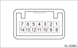 7 (SSW1) — 5 (GND) | Push button ignition switch released > pressed | Continuity exists |