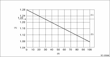 • Measuring the specific gravity of the electrolyte in the battery will disclose the state of charge of the battery. The relation between specific gravity and state of charge is as shown in the figure.