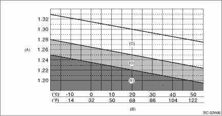 (A) | Specific gravity [20°C (68°F)] | (B) | Electrolyte temperature | (C) | Good |