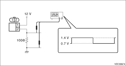 4. Connect a 12 V power supply to No. 1 terminal of ABS wheel speed sensor connector, then attach resistance to the No. 2 terminal. Rotate the wheel at about 2.75 km/h (2 MPH), and measure the voltage using an oscilloscope.