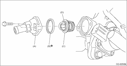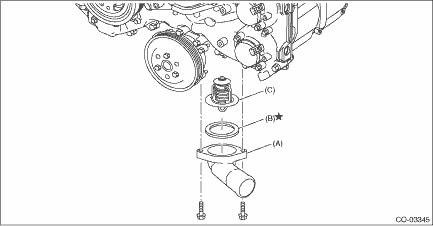 (A) | Thermostat cover | (B) | Gasket | (C) | Thermostat |