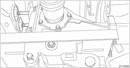 When inserting the stud bolt into the bushing portion of the rear sub frame assembly, adjust the angle and location of transmission jack and jack stand.