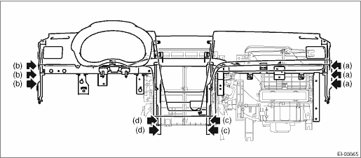 2. Insert the matching pins on the body side (three locations - one in the center and the remaining two on both sides) into the instrument panel assembly and the beam COMPL - steering.