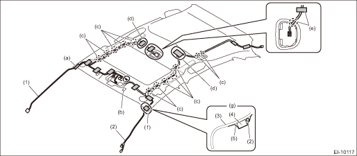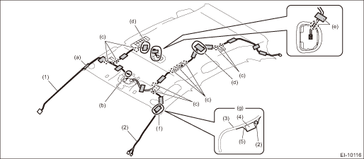 (a) | Align the center of the marking (white tape) on the cord with the trim end, then secure using the tape. | (d) | Adjust the excess cord at (d) position and secure using the tape. | (g) | Route the cord along inside of the cushion (to the vehicle center) and secure using the tape. |