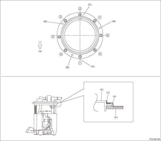 (a) | Front side of vehicle | (c) | Fuel pump upper plate cushion | (e) | Gasket |
