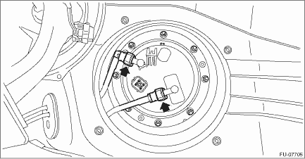 Set the arm and float of the fuel level sensor while paying attention to prevent them from contacting the fuel tank. If the arm of the fuel level sensor is bent, the fuel gauge may not read correctly.