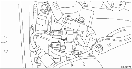 (A) | Front oxygen (A/F) sensor connector | (B) | Rear oxygen sensor connector | (C) | Clip |