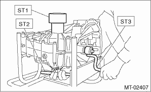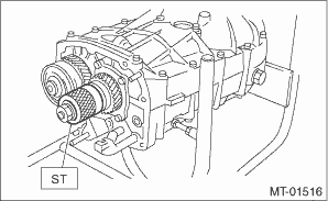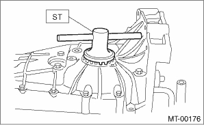 (3) Screw in the differential side retainer from the bottom into LH side case using ST2. Fit the ST3 on the main shaft. Shift the gear into 4th or 5th, and turn the shaft several times. Screw in the side retainer while rotating the ST3 until a slight resistance is felt on ST2.