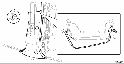 • Do not reuse the upper clips of the trim panel - center pillar UPR. Once the clip is removed, its holding force is reduced. Be sure to replace it with a new clip.