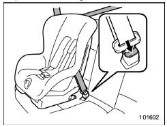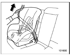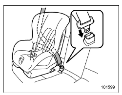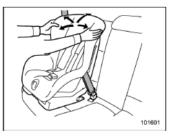 8. Before having a child sit in the child restraint system, try to move it back and forth and right and left to check if it is firmly secured. Sometimes a child restraint system can be more firmly secured by pushing it down into the seat cushion and then tightening the seatbelt.