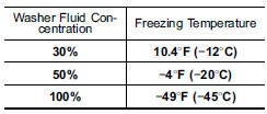 In order to prevent freezing of washer fluid, check the freezing temperatures in the table above when adjusting the fluid concentration to the outside temperature.