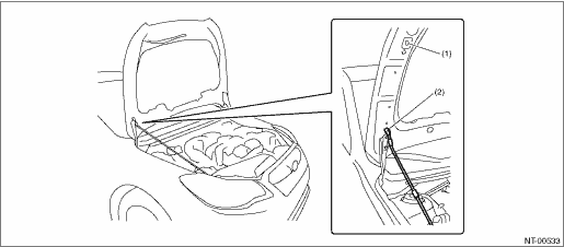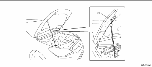 2. When wider front hood opening is necessary, set the stay to the lower position (hood hinge) as shown in the figure.