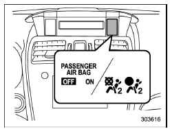Also, if luggage or electronic devices are placed on the front passenger's seat, this may adversely affect the ability of the system to determine deployment. This may prevent the front passenger's frontal airbag ON and OFF indicators from working properly. Check that the indicators work properly.