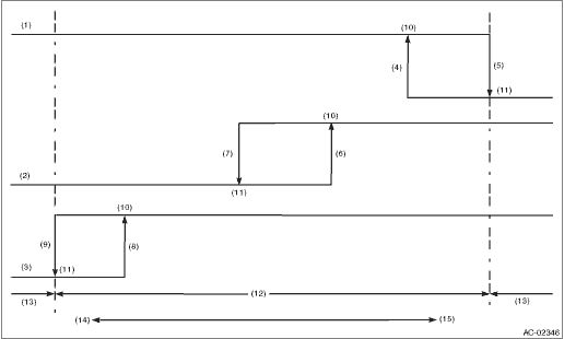 (3) | Low pressure switch | (8) | 225±30 kPa (2.29±0.31 kg/cm2, 32.6±4.3 psi) | (13) | Inoperative range of compressor ASSY |