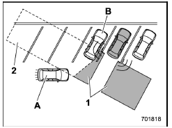 An approaching vehicle (A) may not be detected because the detection range is limited by the parked vehicle (B). Always be sure to check the surroundings with your eyes when reversing the vehicle.