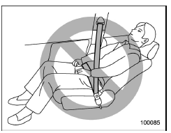 To prevent the passenger from sliding under the seatbelt in the event of a collision, always put the seatback in the upright position while the vehicle is in motion. Also, do not place objects such as cushions between the passenger and the seatback. If you do so, the risk of sliding under the lap belt and of the lap belt sliding up over the abdomen will increase, and both can result in serious internal injury or death.
