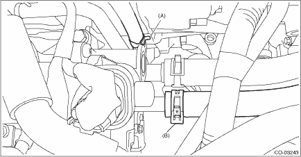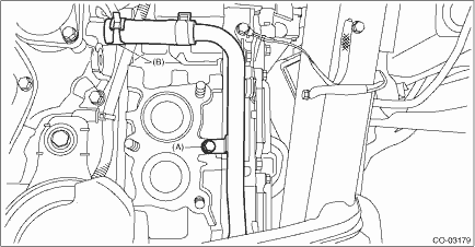 6. Disconnect the water pipe hose RH (B) from oil pan upper, and remove the water pipe assembly RH.