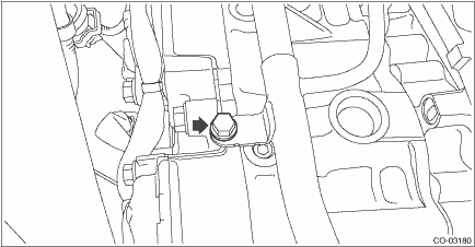 26. Remove the bolt which holds the transmission harness to the control valve body, and turn the transmission harness clockwise till the bolt hole can be seen as shown in the figure, and tighten the bolt to temporary lock the harness. (CVT model)