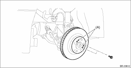 When the disc rotor is difficult to be removed from the front hub unit bearing, screw in 8 mm (0.31 in) bolt to the threaded part of the disc rotor (A), and remove the disc rotor.