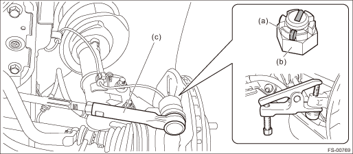 (3) Using a tie-rod ball joint puller, remove the tie-rod end (c).