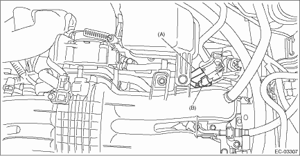 4. Disconnect the vacuum hose (A) and connector (B) from the purge control solenoid valve, and remove the purge control solenoid valve.