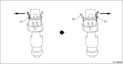 (2) While holding one side of fuel injector holder (B) you removed in step (1) by finger, remove the other side of fuel injector holder from the flange section (C) of the fuel pipe.