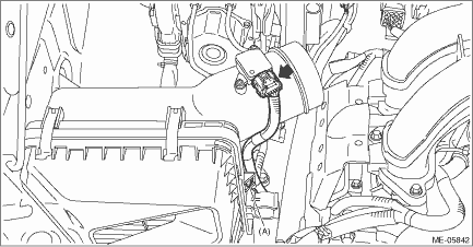 (3) Disconnect the connector from the mass air flow and intake air temperature sensor, and remove the clip (A) securing the bulkhead wiring harness.