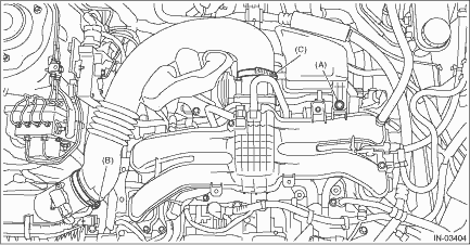 5. Remove the clip (A), and loosen the clamps (B) and (C) securing the air intake boot.